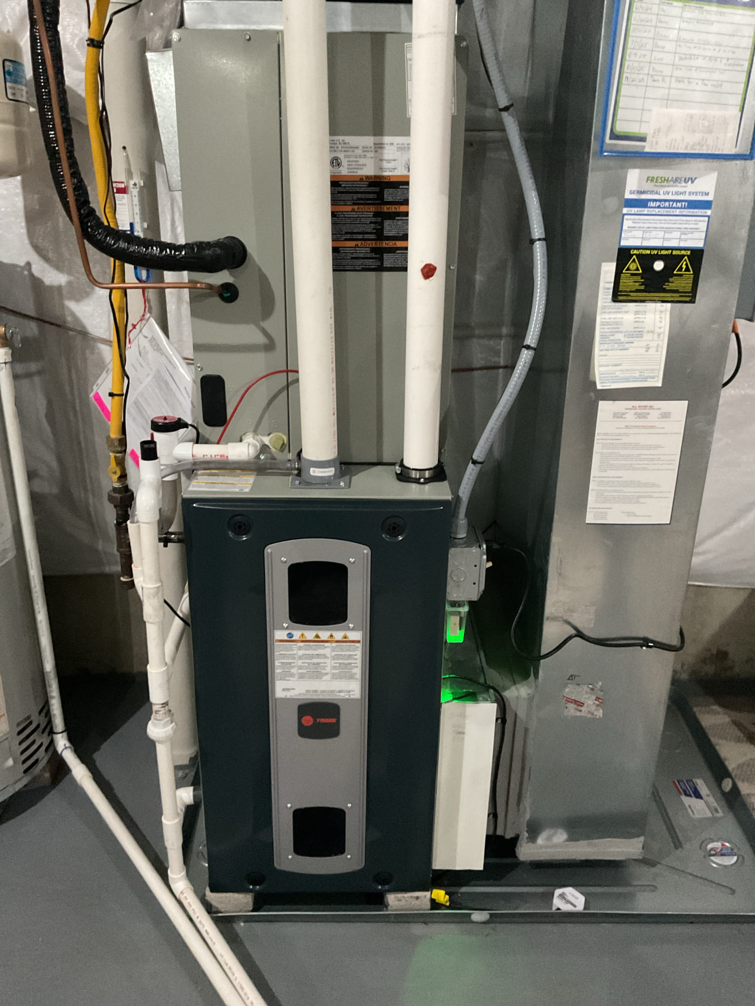 Installed new Trane furnace and coil on 30x30 metal pan. All new return drop and custom supply plenum. Installed 2410 filter rack and Apco air purifier with UV light. Installed T6 WiFi thermostat. Ran condensate to gravity drain. Installed wet switch and EZ trap. Adapted to existing fuel line and vent runs. Installed blower motor surge protector. Installed new Trane 3 ton outdoor unit. Replaced wall bracket to fit size of new unit. Replaced lineset. Installed disconnect with surge protector. Cleaned work area and tested all operations. Adjust pressures appropriately in spring time.