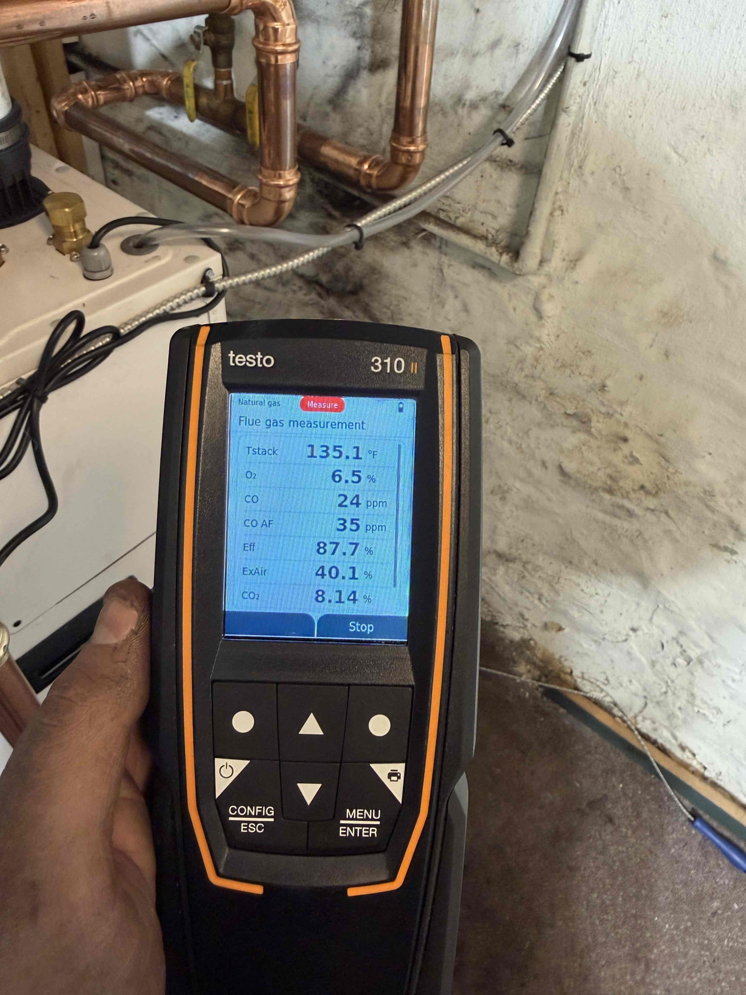 Installed Laars boiler. Ran exhaust pipe out side. Adapted to supply and return piping. Adapted to cold and hot lines. Installed sir eliminator and shut off valves. Adapted to old zone valves, circ pump, and relays. Installed a 40 va transformer to power everything. Someone will need to return to install a 75 va transformer in place of it. Tested system and set domestic water to 120°